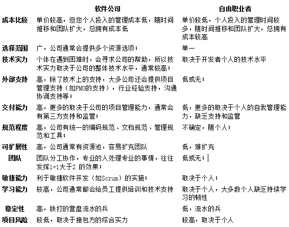 结论:软件公司和个人职业者,没有绝对的高下,只是相对来说在某些方面各有优势。因此它们都有自己所适合的场景,总体来说,要根据您所处的情境来选择: