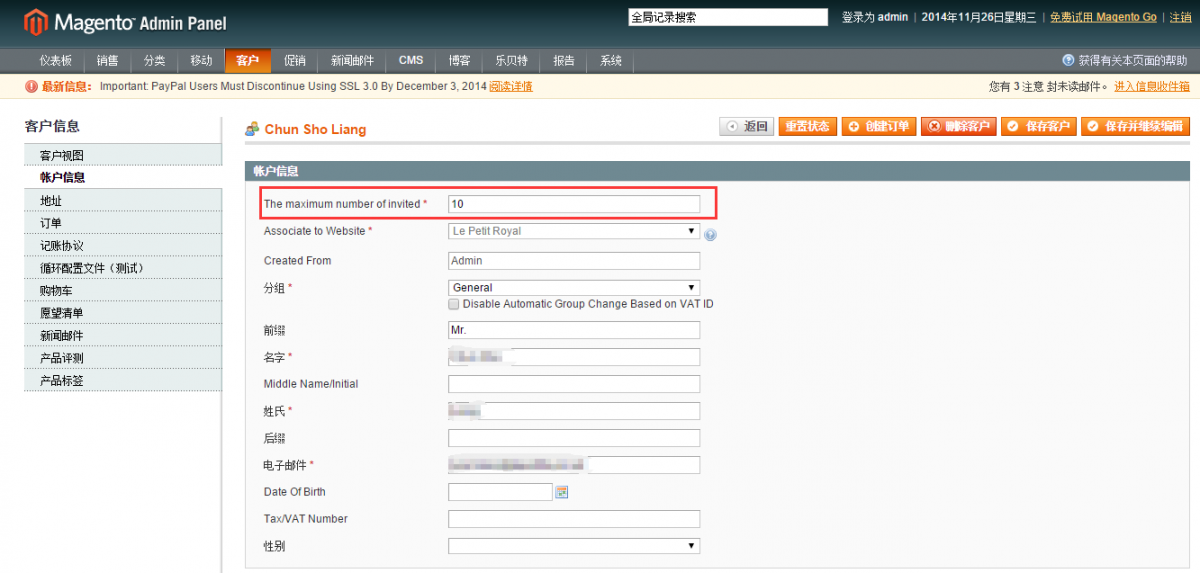 后台设置用户可邀请数: