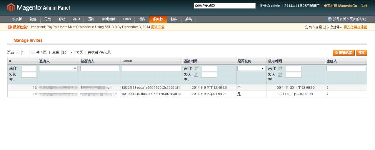 由于客户要求被邀请的人才能注册,并且可以限制每个人的邀请数,所以我们开发了这个模块。相关截图如下: